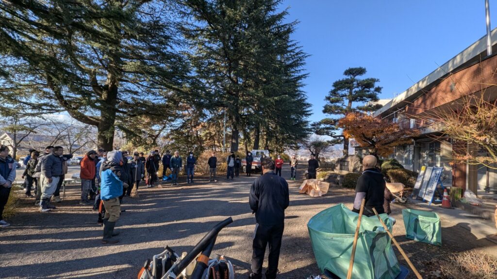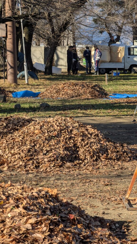 12月7日(日)上田市北部地区まちづくり協議会 環境・生活部会主催の”北小落ち葉集め”が 開催されました。今年も北小応援団、児童・保護者、地元新田自治会、グランドを利用するソフトボール北部リーグ、教職員他の皆様のご協力により「花とみどりと笑顔の学校」北小の恒例行事となりました。